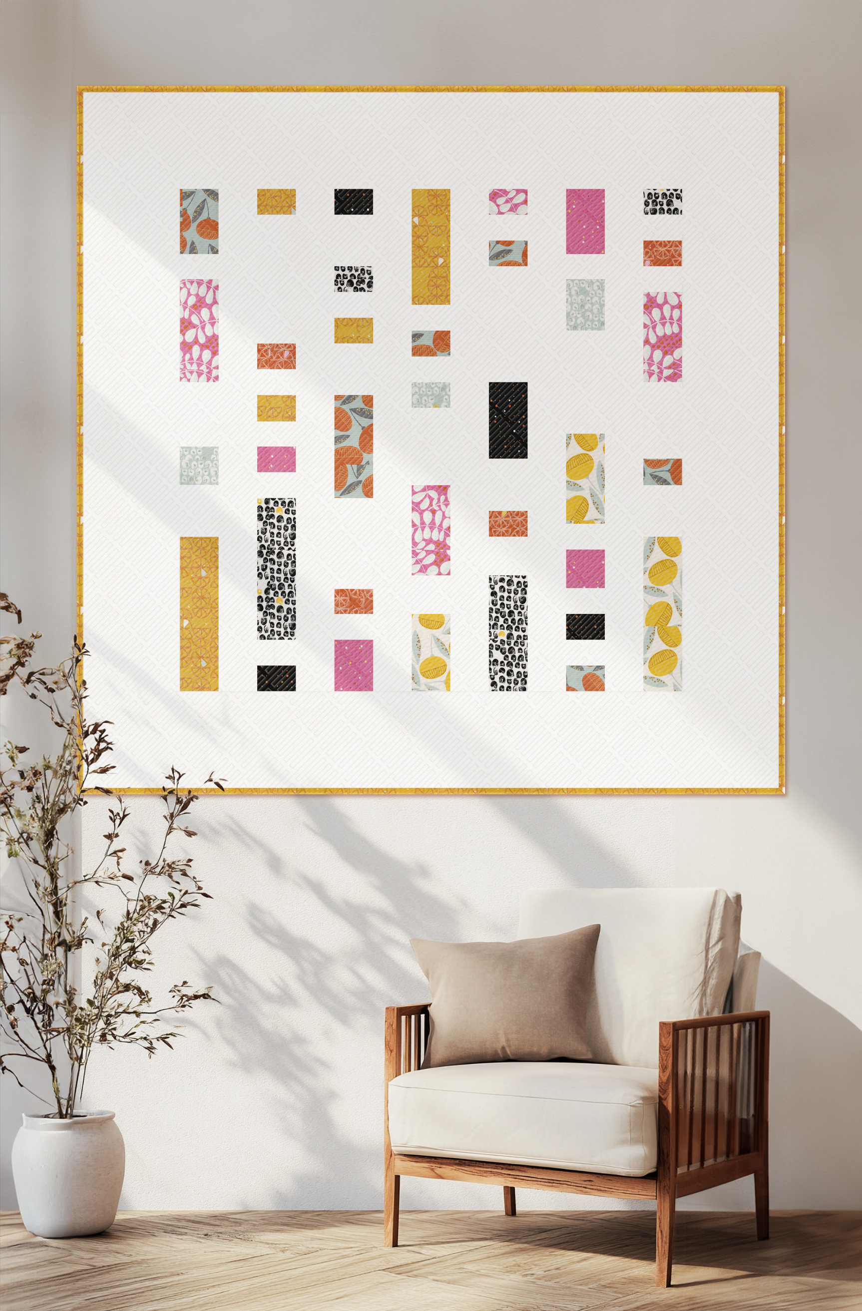 I designed this little charmer using just 9 Fat Eighths from the BALISONG collection. Nine! I threw in sassy pinks, sunny yellows, and bold blacks for serious visual pop. The generous negative space? That's what gives it that breezy, modern-art vibe.
